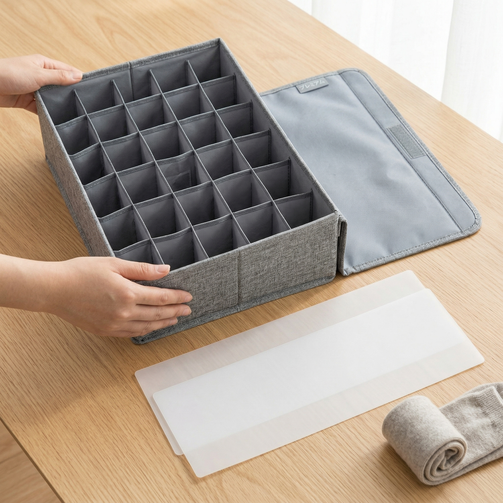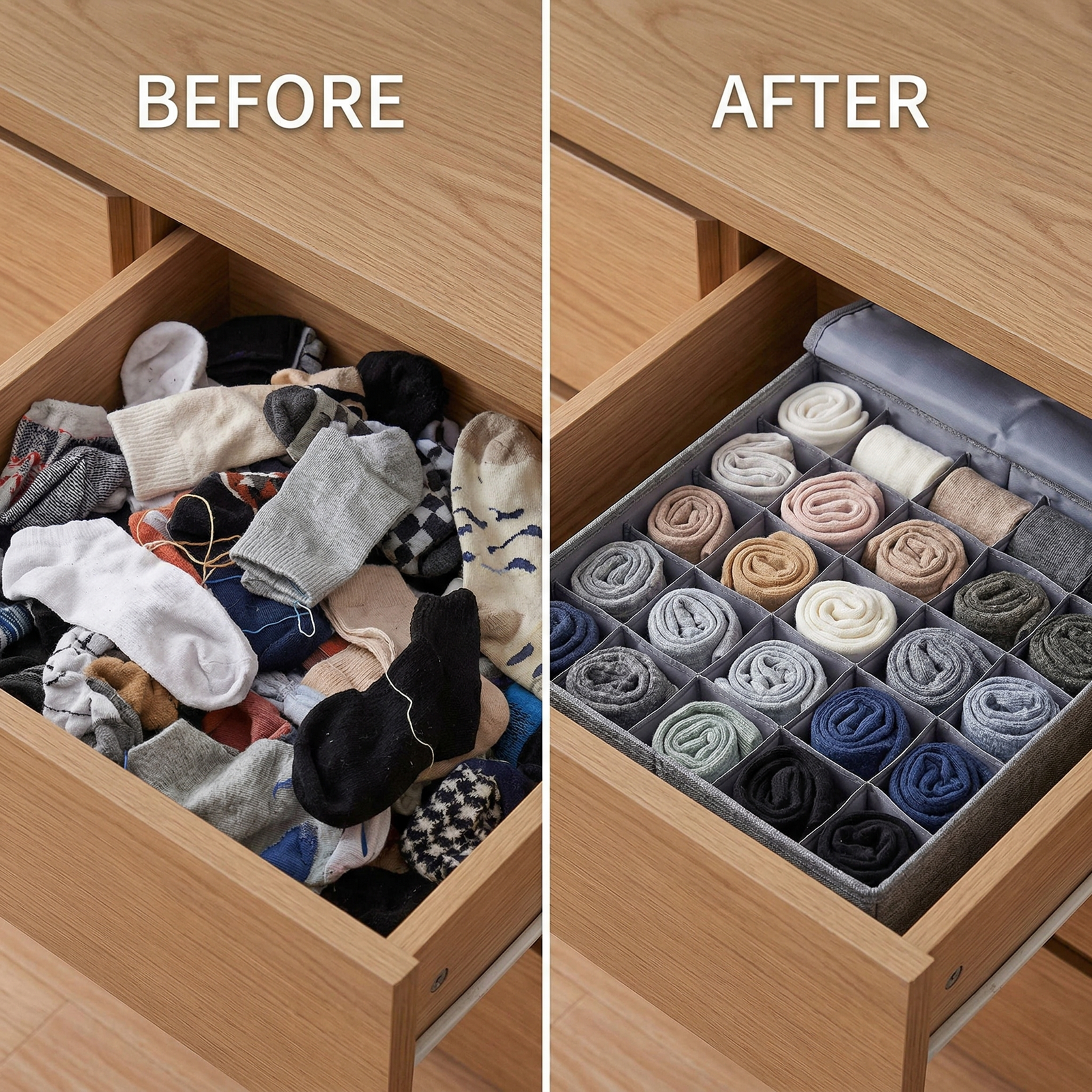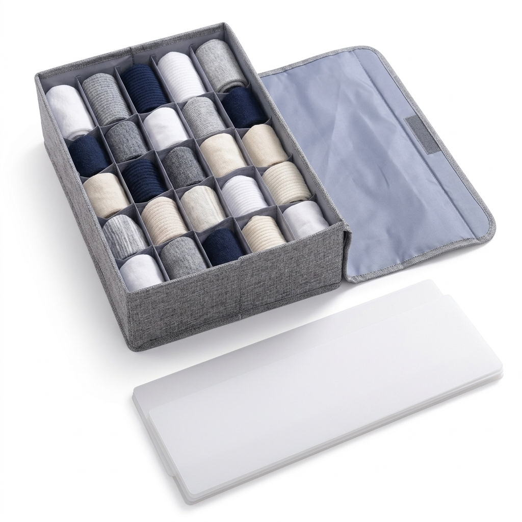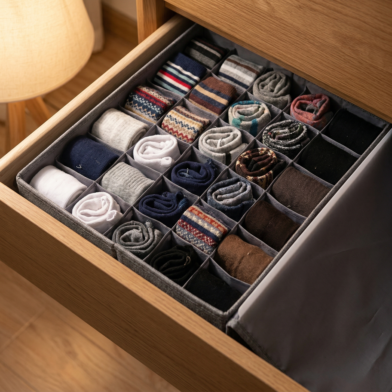 Smart 4-Grid Layout: Divided into four spacious sections, ideal for categorizing socks by color, type, or family member. It also works perfectly for ties, belts, and delicate undergarments.
