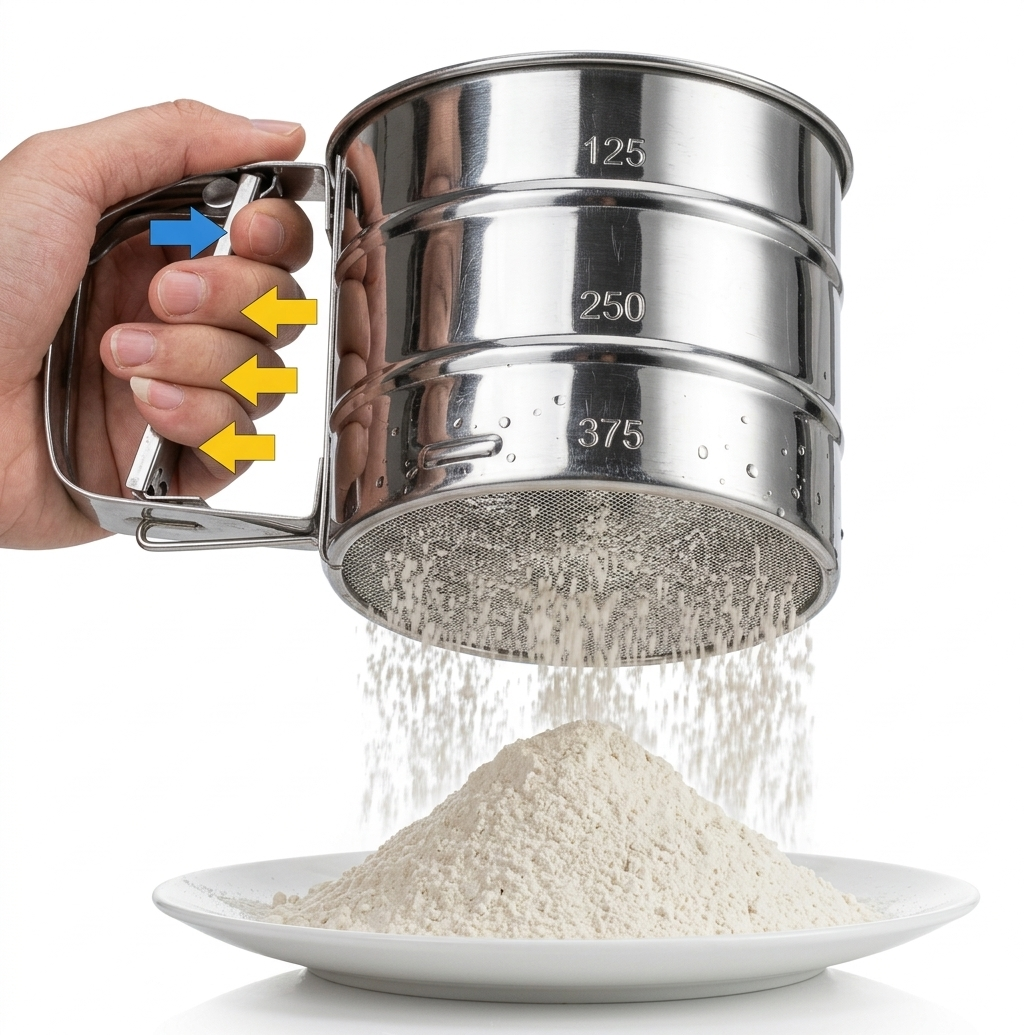 • One-Handed Operation: Designed with a convenient squeeze-trigger handle. Simply press the handle to rotate the internal blades and sift flour effortlessly with one hand.